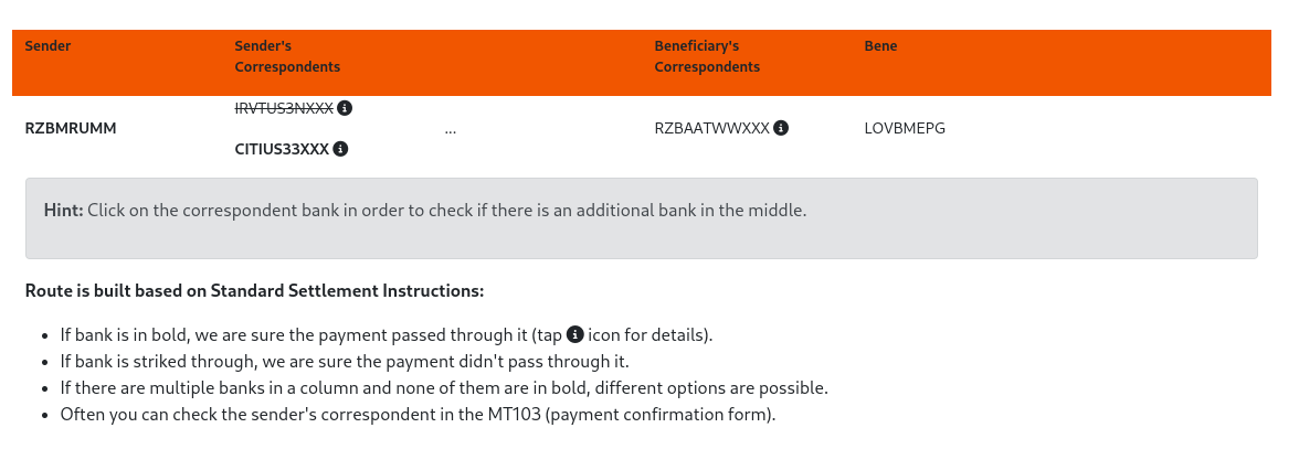 En el ejemplo anterior, se puede ver que el pago no pasó por el Banco de Nueva York Mellon (código swift/bic IRVTUS3N), sin embargo, sabemos que pasó por Citibank. Si haces clic en el icono “i”, también puedes verificar cuál fue el estado en este banco.